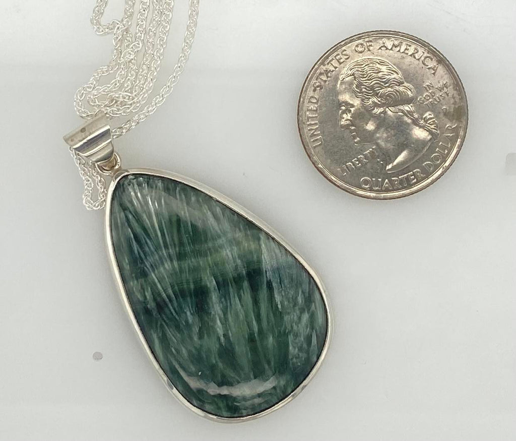 Seraphinite. a beautiful deep green with white and silver inclusions resembling feather like patterns that give this silicate material the name of the highest biblical angels. Geologically, this mineral is a clinochlore is a silicate material called a clinochlore. The trade name is seraphina, named after the seraphim angels in the Bible. A favorite from Russia, seraphinite is associated with the utmost protection.