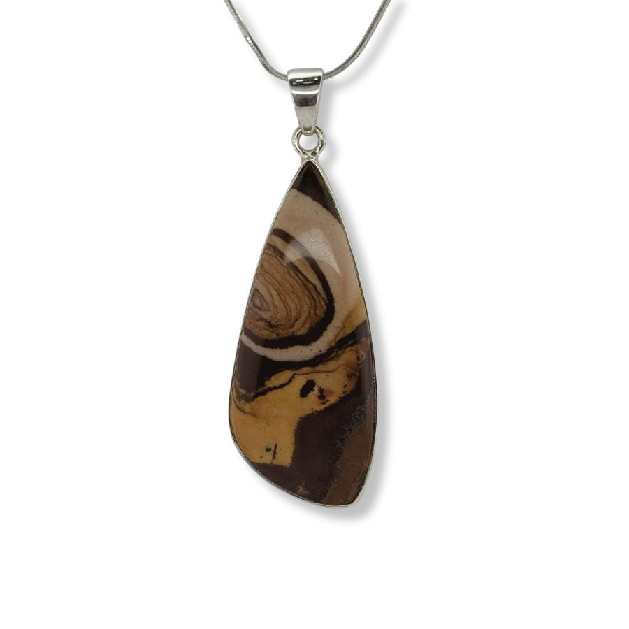 This striking pendant showcases Australian Picture Jasper, a natural stone celebrated for its scenic patterns that resemble painted landscapes. Formed over millions of years from silica-rich sediments, its earthy hues of russet, gold, and soft brown echo the warmth of autumn leaves. Known as a stone of connection and grounding, Picture Jasper is believed to inspire creativity, inner peace, and a deeper bond with the natural world.