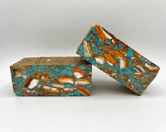In composite form, small pieces of turquoise and spiny oyster are carefully arranged, stabilized, and bonded to create a single, durable material. This creates a brick we buy when we are at the gem and mineral show in Tucson!