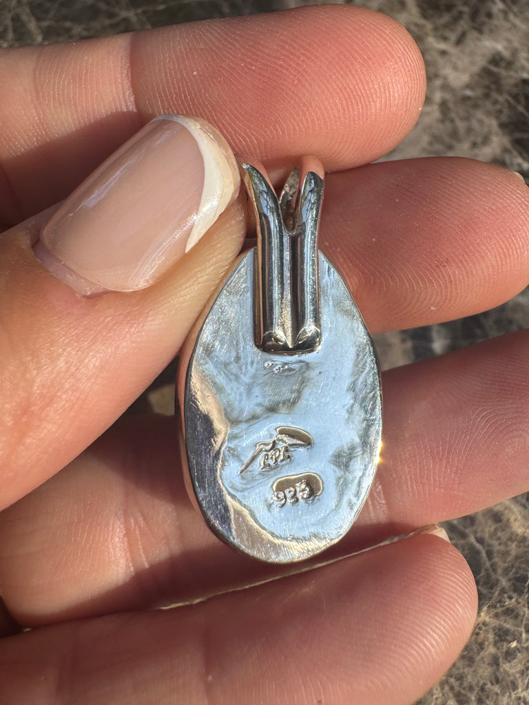 A rare fusion of artistry and geology: this Bridewell Stone triplet pendant captures the balance between nature’s raw patterns and a silversmith’s precision. The cabochon features layers of natural stone, fused to enhance depth, color, and light reflection, a technique that reveals breathtaking dimension beneath the surface.
