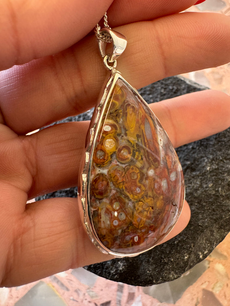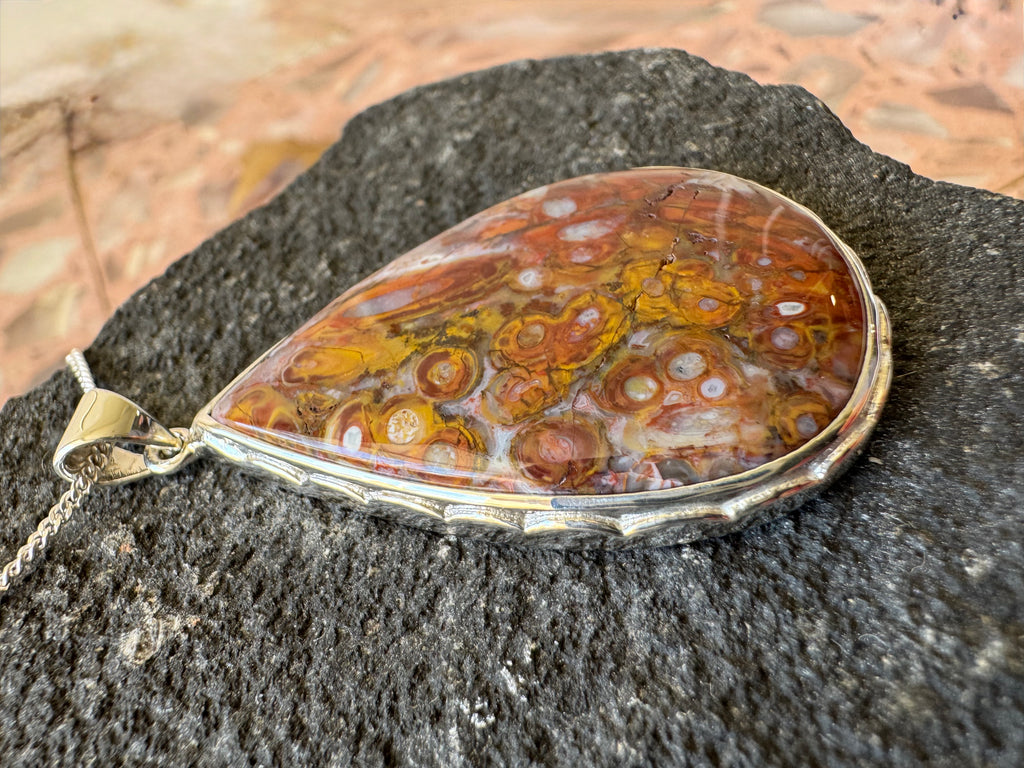 Fossilized eggs of the Caddis Fly in Ancient Palm Trees. Set in 925 sterling silver with 24” adjustable chain
