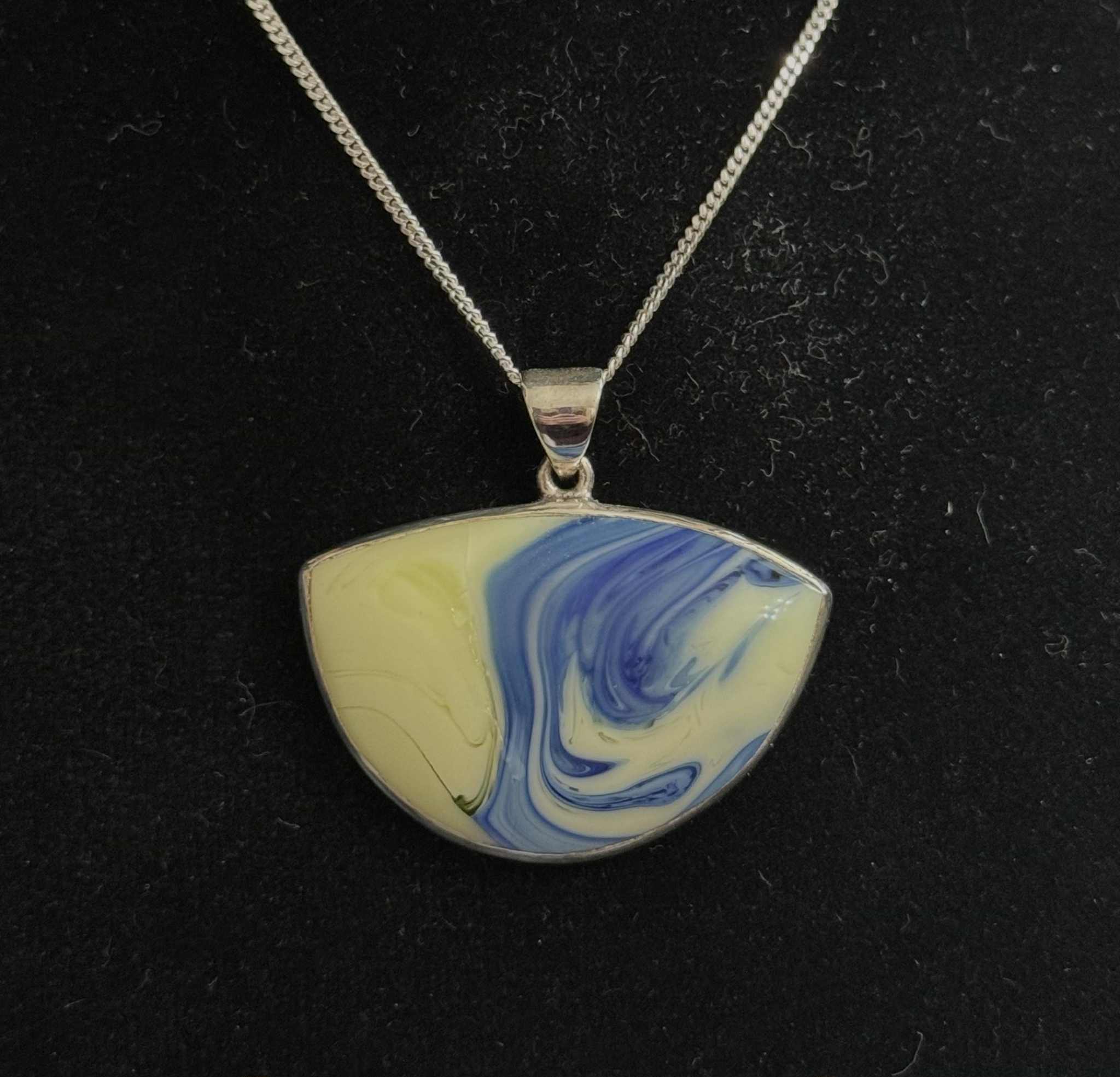 A true piece of history, this pendant features authentic Houze glass dating back to 1914, crafted in Chicago during the height of America’s early industrial artistry. Houze glass is known for its vibrant color, durability, and unique surface character—often used in architectural panels, signage, and decorative pieces of the era. Now set in 925 sterling silver, this glass fragment has been given new life as a wearable treasure.