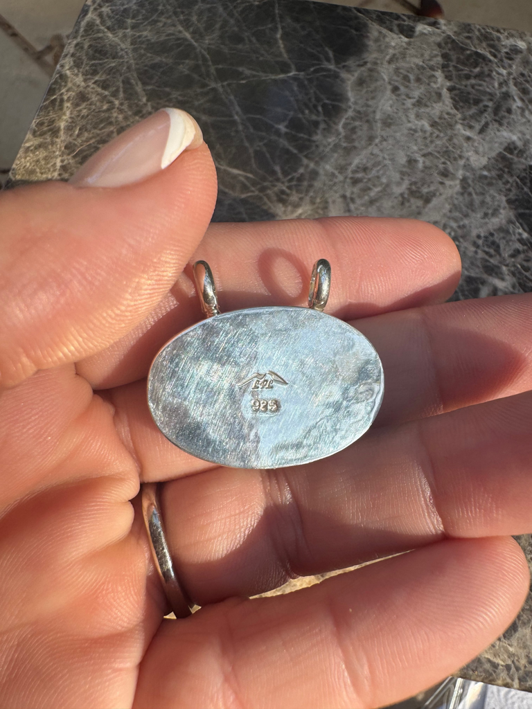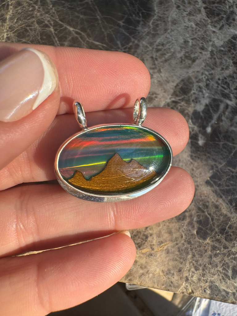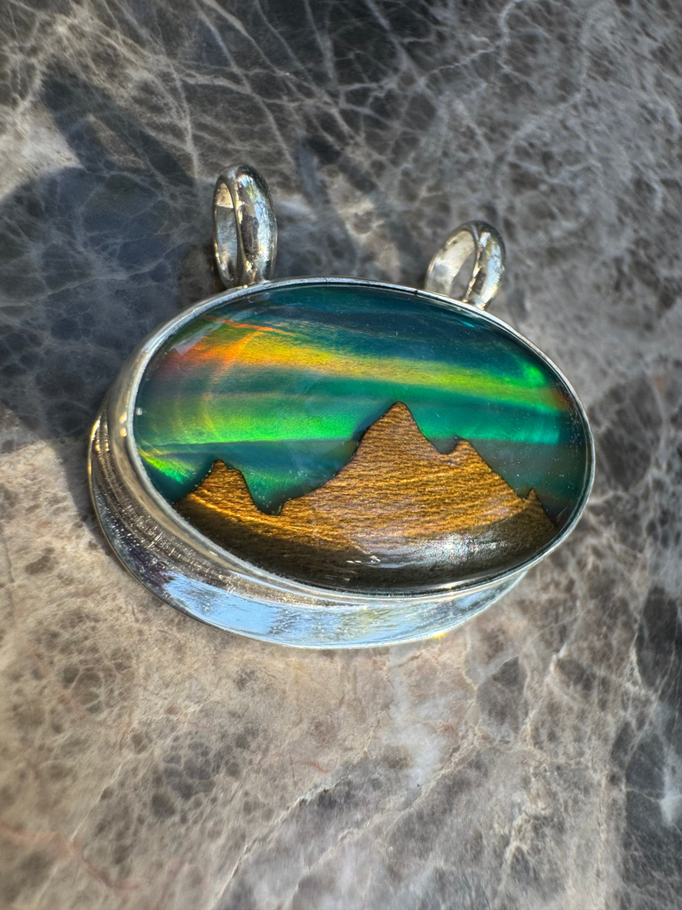 Each piece is hand-cut and set in solid 925 sterling silver, designed to evoke mountain silhouettes beneath a glowing aurora sky. Small but full of life, this pendant changes color with every angle, a reminder that nature’s artistry is never still.