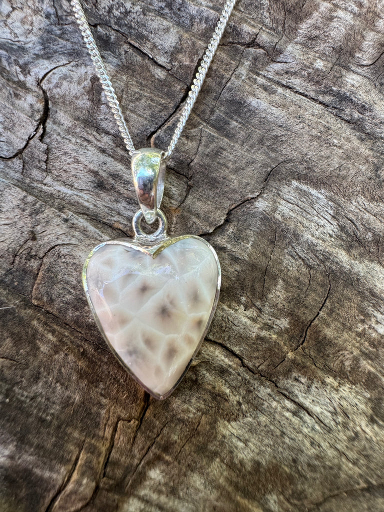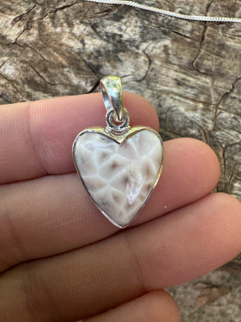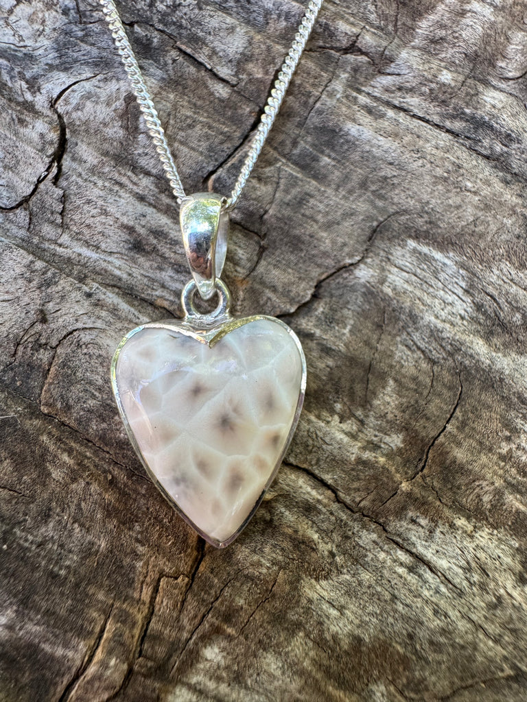 Natrolite Heart Pendant set in 925 Sterling Silver is backordered and will ship as soon as it is back in stock.