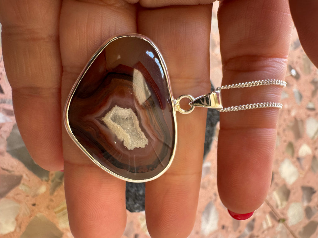 Old Stock Red Banded Druzy Agate set in 925 sterling silver with 24” adjustable chain