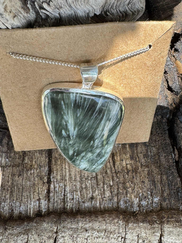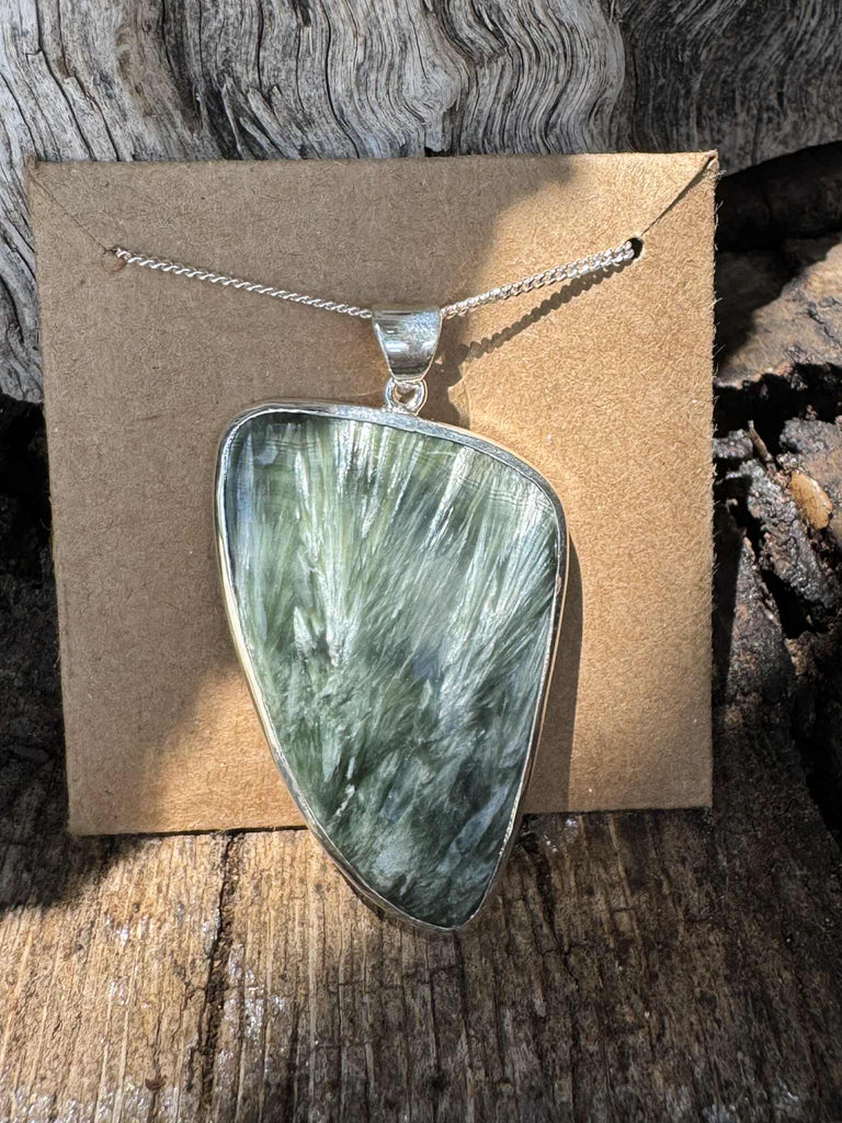 Cabochoned genuine Siberian seraphinite, this pendant reveals the stone’s mesmerizing feather-like chatoyancy, a natural shimmer created by silvery mica inclusions. Seraphinite, a rare variety of the chlorite group, is found almost exclusively in the Lake Baikal region of Siberia and is prized by collectors for its deep forest-green body shot through with angel-wing patterns.