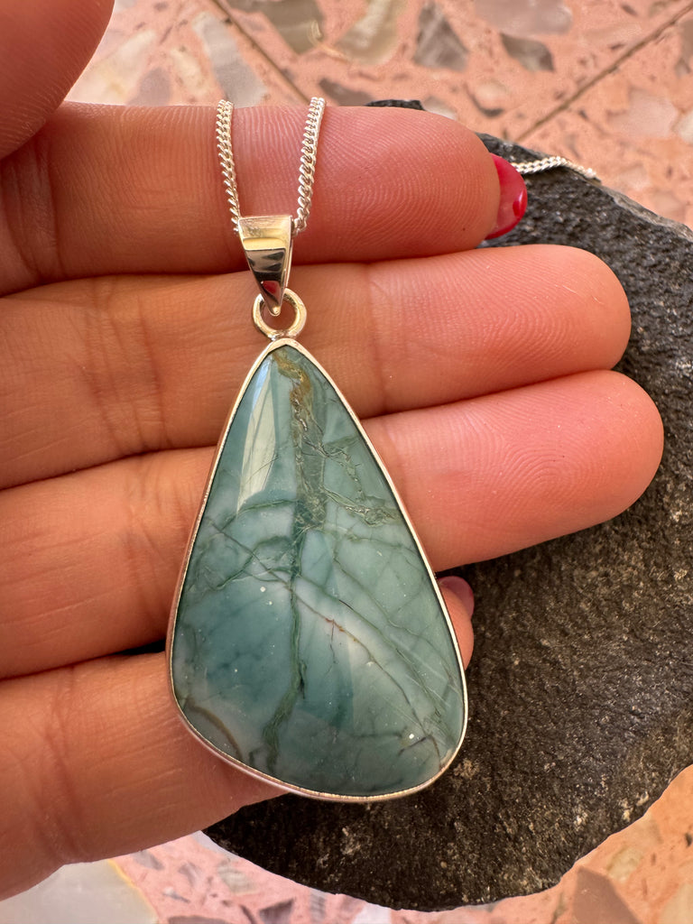 A porcelain Jasper from Oregon. Set in 925 sterling silver with 24” adjustable chain